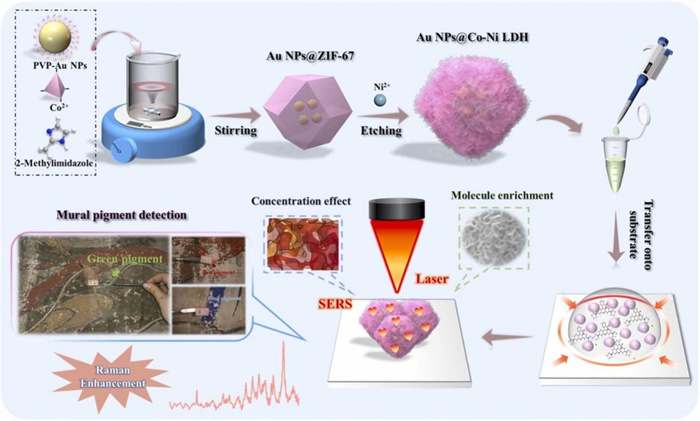 对痕量残损脱落的壁画颜料进行无额外人工损伤性检测是壁画修复工作的重要前提。由于文物上可用于检测的量比较小,因此通过浓缩富集微量待测分子用于表面增强拉曼散射(SERS)增强进行分析是很好的策略。研究团队构筑了具有浓缩效应的等离子体多孔材料Au NPs @ Co-Ni LDH,将其应用于微量绿色、红色、蓝色三种壁画矿物颜料的微损检测,可识别出它们的主要成分分别为氯铜矿、朱砂和群青,证明其对于不同地区、不同种类的壁画颜料具有良好的普适性。论文通讯署名单位国产亚洲精品美女久久久_99久无码中文字幕一本久道_亚洲成AV人影院_亚洲AV影院一区二区三区 狠狠躁夜夜躁人人爽天天不卡_国产激情久久久久影院老熟女_精品性高朝久久久久久久化学与化工学院,张献明教授和我校青年教师郭绍晖和柏小剑为通讯作者,2023级硕士生温静为论文第一作者(DOI:10.1016/j.jece.2025.117101)。